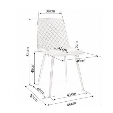 - Kėdės matmenys: Gylis 42 cm / Plotis 46 cm / Aukštis 84 cm. Sėdimos dalies aukštis 49 cm.