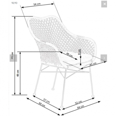 - Kėdės matmenys: Gylis 64 cm / Plotis 64 cm / Aukštis 89 cm. Sėdimos dalies aukštis 48 cm.