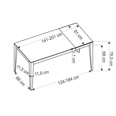- Stalas: Aukštis: 76 cm; Plotis: 81 cm; Ilgis: 141-201 cm
